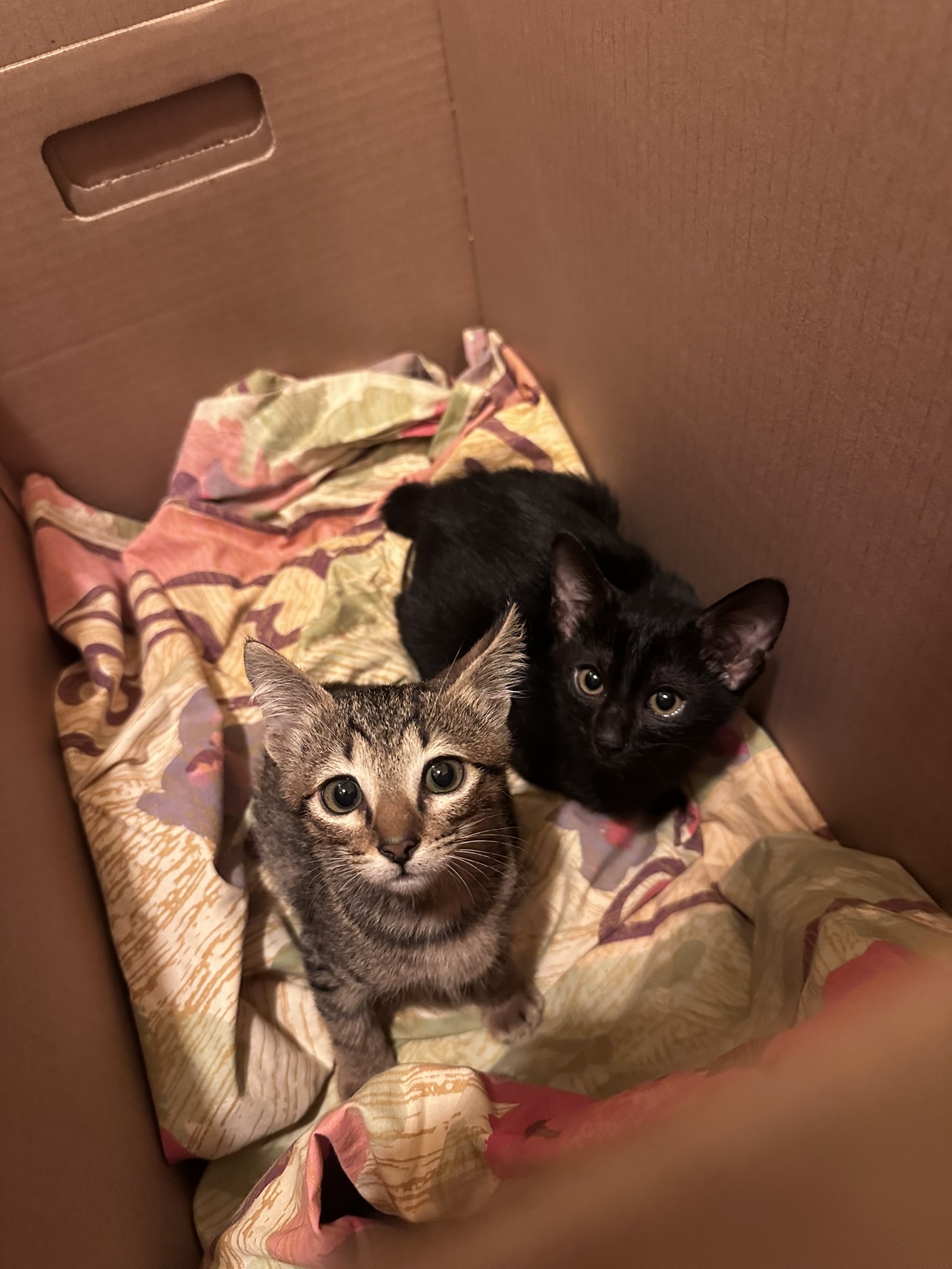 The grief for Maoler still remains, but my mother and brother had started entertaining the thought of adopting a cat again. My return to my childhood home this week—a visit between work trips abroad, while my cat boys are well cared for by a friend—was the nudge from idea to action. Scrolling through the Facebook page of the cat rescuer who had led Salty and Begbie to us, a collage of photos caught my attention: two kittens peering at the camera from a cat tree, one a tiny tabby girl, another a little black kitten who seemed, as kittens often do, to be made up almost entirely of ears.
